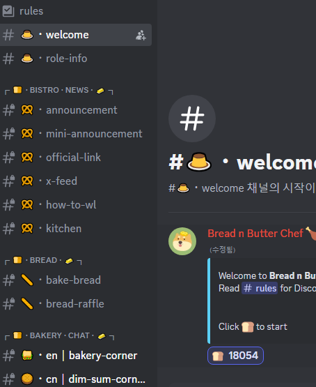 위 사진 처럼 welcome을 클릭하셔서 식빵이모지를 클릭하셔야 채널이 나오고, 채팅도 칠 수 있습니다